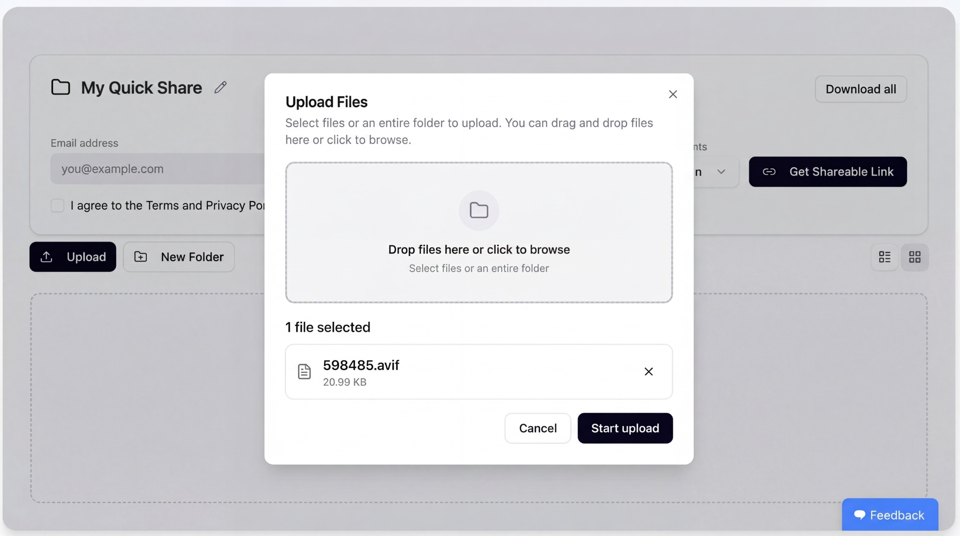 Drag and drop your file directly into the upload area or pick it from your computer.