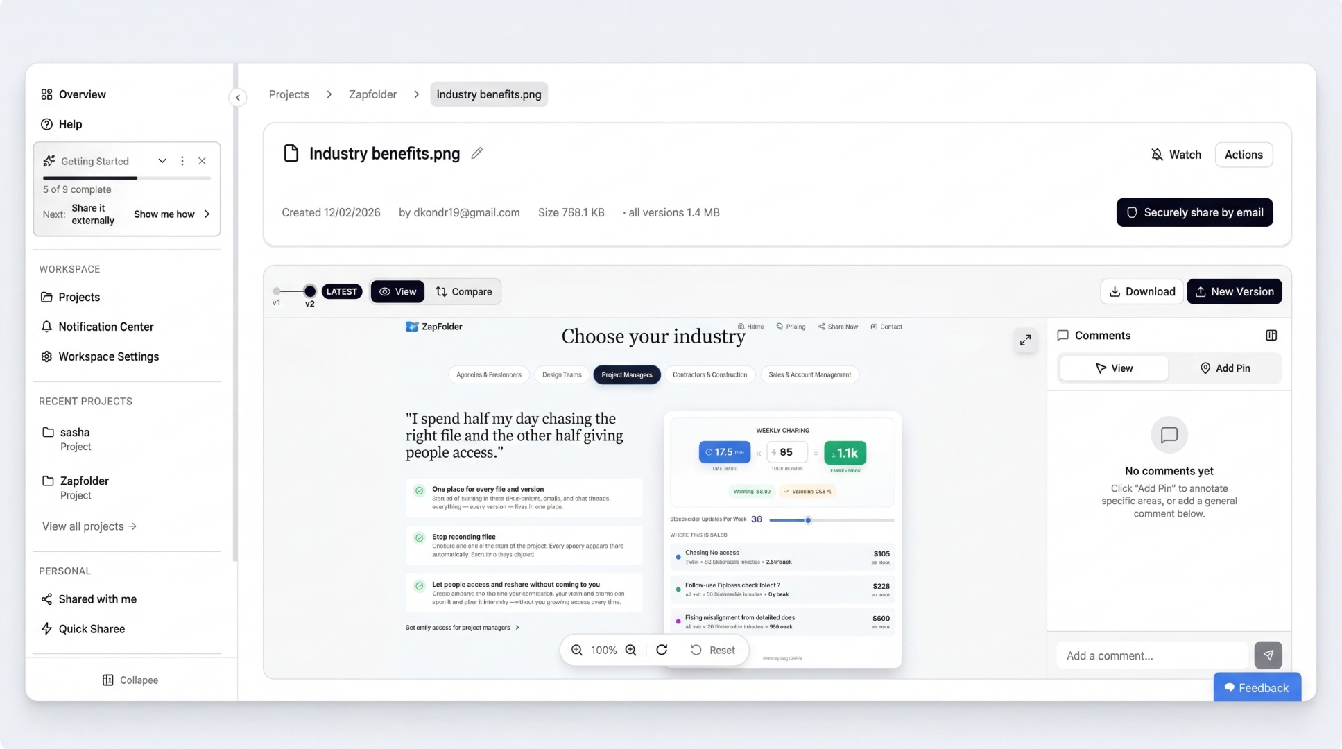 To create permanent project links with version control, click Start Sharing for Free and claim your free ZapFolder account.